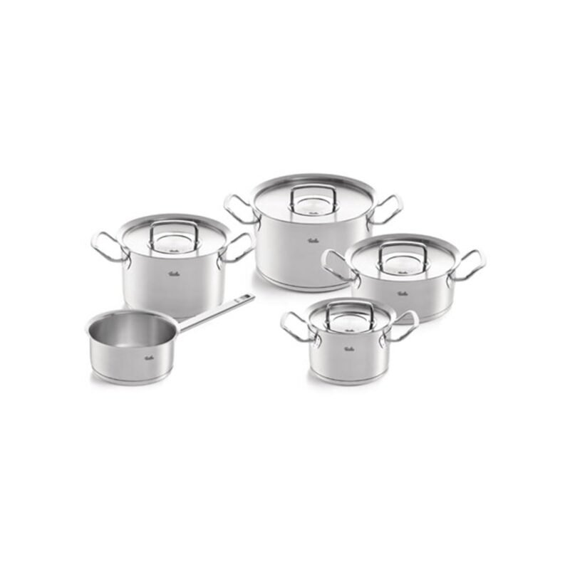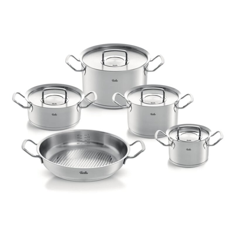 Fissler Original-Profi Collection/Edelstahl-Topfset, 5-teilig, Töpfe mit Metall-Deckel (3 Kochtöpfe, 1 Bratentopf, 1 Servierpfanne) – Induktion