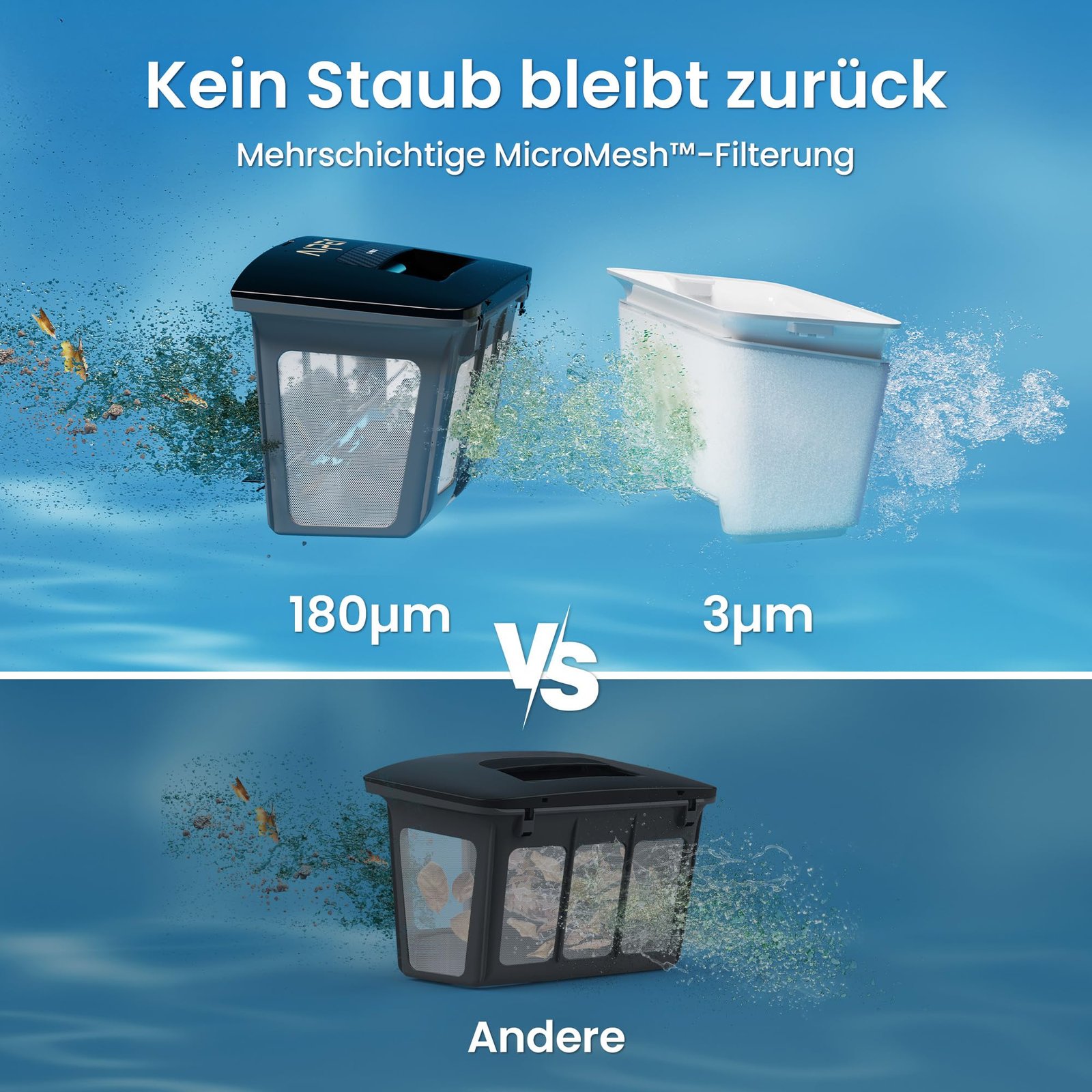 - Maximale Filtration bis 3 Mikron: Das MicroMesh-System kombiniert einen 180-Mikron-Grobfilter mit einer ultrafeinen 3-Mikron-Schicht. Ihr Poolreiniger entfernt selbst unsichtbare Partikel und Sand fĂĽr kristallklares Wasser.
