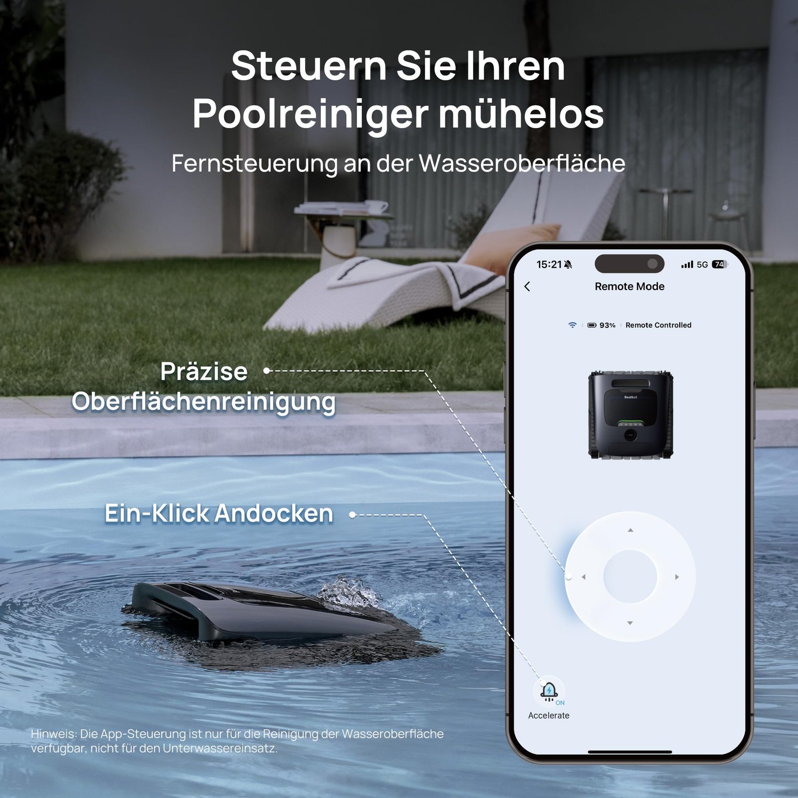 • Fernsteuerung auf der Wasseroberfläche: Steuern Sie die Richtung des Roboters, beschleunigen Sie fĂĽr etwas ReinigungsspaĂź und lassen Sie das Gerät mit nur einer BerĂĽhrung andocken – alles einfach ĂĽber die App. Diese Branchenneuheiten sorgen fĂĽr eine genaue Reinigung der Oberfläche. Mit dem Roboter haben Sie Ihren Pool in der Hand!