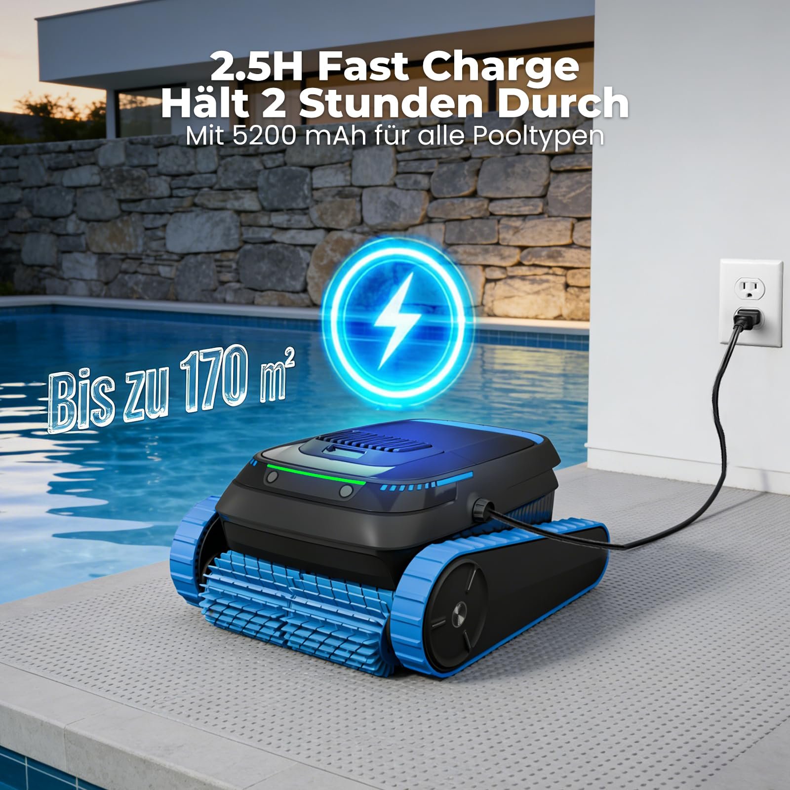 - 【Lange Laufzeit】Der BOTLUXE Poolroboter verfügt über einen leistungsstarken 5.200-mAh-Lithium-Ionen-Akku, der einen effizienten und energiearmen Betrieb ermöglicht. Die Ladezeit beträgt lediglich circa 2,5 Stunden. Er eignet sich für alle Arten von ober- und unterirdischen Pools (rund, rechteckig, nierenförmig und freigeformt) mit einer Fläche von bis zu 170 Quadratmetern und einer Wassertiefe von bis zu 3 Metern.