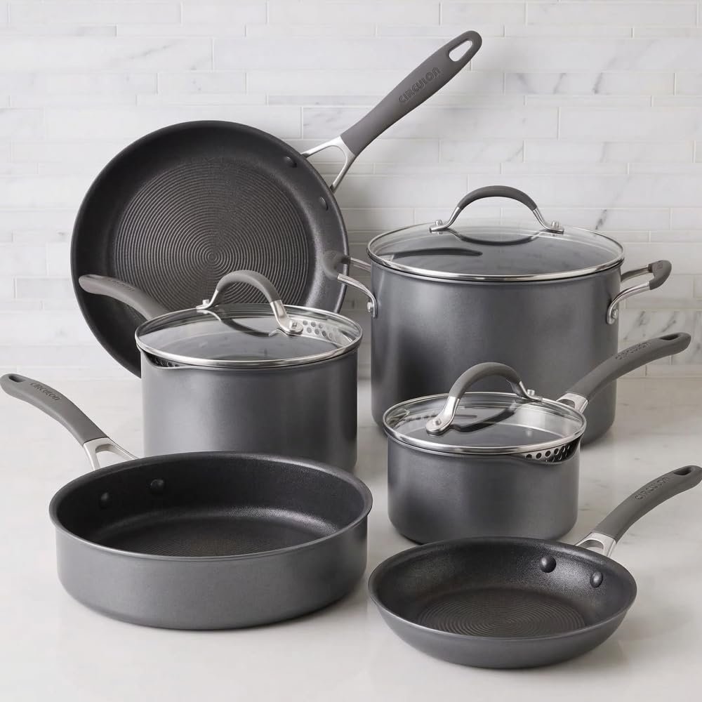 Einzelheiten: Extrem antihaftbeschichtet, die nicht zerkratzt. EVER. Von den Erfindern des harteloxierten Antihaft-Kochgeschirrs kommt die Circulon A1-Serie mit ScratchDefense™-Technologie. Eröffnen Sie eine neue Dimension in Sachen Kratzfestigkeit und unschlagbarer Antihaftleistung und Langlebigkeit mit der bahnbrechenden ScratchDefense™-Antihaft-Technologie, die aus langlebigen Materialien in Luftfahrtqualität hergestellt wurde, um eine dickere und härtere Oberfläche als gewöhnliche Antihaftbeschichtung zu schaffen und Kratzer, Anhaften und Abblättern mit unserer fortschrittlichsten Antihaftbeschichtung zu vermeiden. Kochen Sie mit vollem Vertrauen mit diesen spülmaschinenfesten Töpfen und Pfannen mit einer dreilagigen Antihaft-Kochfläche, die 130 x länger hält als die Konkurrenz und Labortests standhält, die mehr als 200 Jahre täglicher Abnutzung simulieren. Dieses Set von Küchenutensilien beinhaltet 1 Quart und 3 Quart Töpfe mit Siebdeckel und Ausgießer, einen 6 l Suppentopf mit Deckel, eine 3 Quart Schmorpfanne und 21,6 cm und 25,4 cm Bratpfannen. Diese leistungsgrundierten und funktionsfähigen Töpfe und Pfannen sind spülmaschinenfest, ofenfest bis 200 °C und mit einem Aluminiumkern für eine schnelle, ganzflächige Wärmeabgabe und einem dicken, induktionsgeeigneten Edelstahlboden für mehr Haltbarkeit und Wärmespeicherung ausgestattet. Pioniertechnologie Extreme Haltbarkeit Makellose Leistung. Die Circulon A1-Serie mit ScratchDefense™-Technologie ist absolut robust, überarbeitet für absolutes Kochvertrauen.