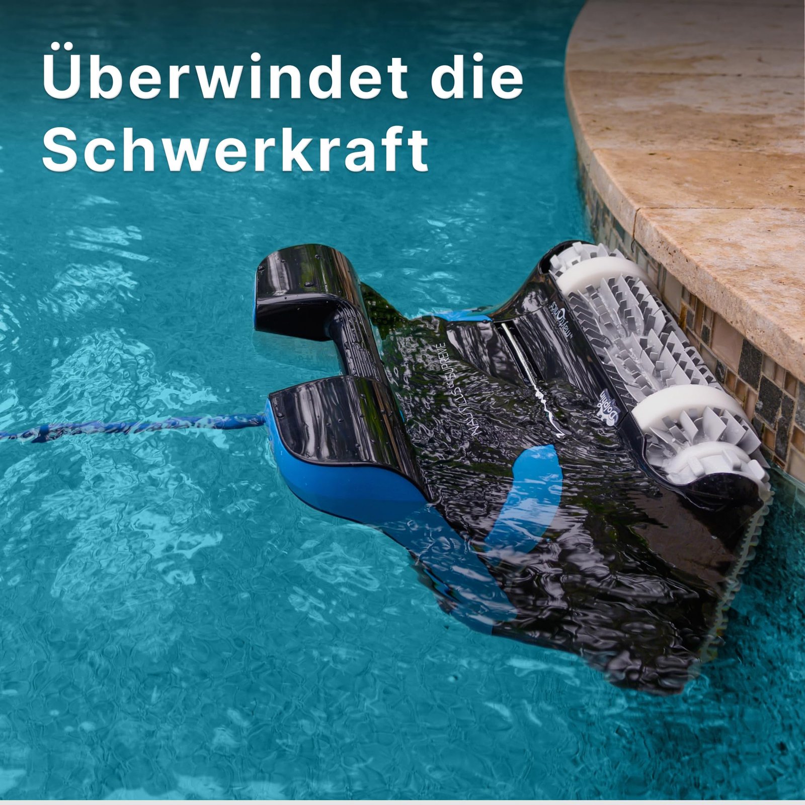 - Überwindet die Schwerkraft:Dieser Poolroboter überwindet jedes Hindernis. Er navigiert mühelos über die Pooloberfläche, klettert Wände hoch und reinigt die Wasserlinie.