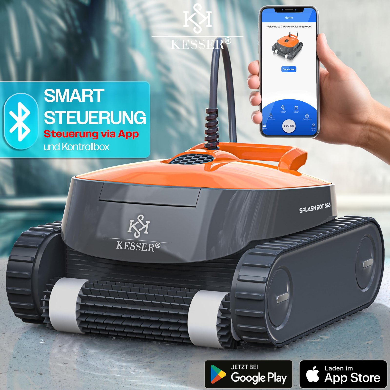 • 𝐒𝐌𝐀𝐑𝐓 𝐒𝐓𝐄𝐔𝐄𝐑𝐔𝐍𝐆 𝐕𝐈𝐀 𝐀𝐏𝐏 𝐔𝐍𝐃 𝐊𝐎𝐍𝐓𝐑𝐎𝐋𝐋𝐁𝐎𝐗: Der KESSER Poolroboter bietet eine benutzerfreundliche Steuerung über eine App und eine Kontrollbox, die es Ihnen ermöglicht, den Reinigungsprozess Ihres Pools bequem zu überwachen und zu steuern. Diese Technologie gewährleistet, dass Sie jederzeit und überall den Status Ihres Poolroboters überprüfen und anpassen können, was für maximalen Komfort und Effizienz sorgt.