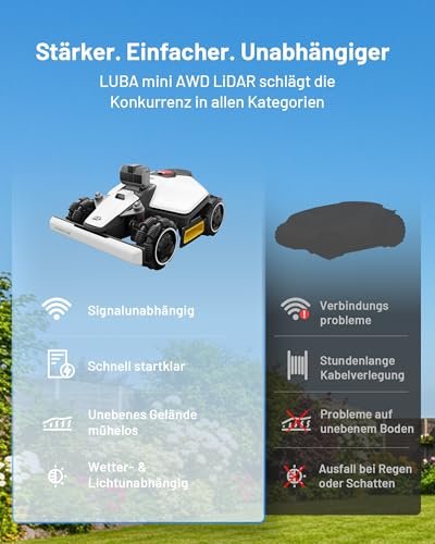 Auch bei Komfort und Sicherheit überzeugt das Modell mit GPS-Tracking, Geofencing-Warnungen, Anhebeerkennung und Unterstützung für Apple „Wo ist?“. Bei starkem Regen oder extremen Wetterbedingungen stoppt der Mähroboter automatisch und fährt selbstständig zur Ladestation zurück. Der leise Betrieb mit nur 59 dB(A), die Unterstützung für Alexa und Google Assistant sowie die wasser- und staubdichte Bauweise nach IP66 machen den Mähroboter besonders alltagstauglich.
