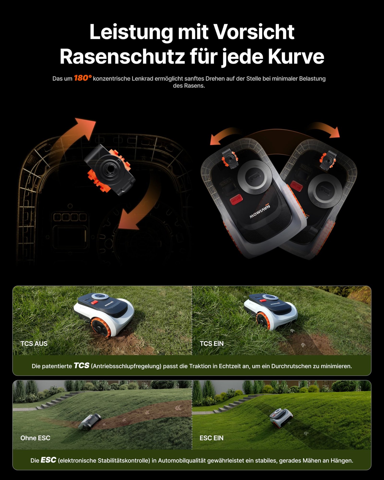 Dank Allradantrieb, Traktionskontrolle und elektronischer Stabilitätskontrolle meistert der Mähroboter Steigungen bis zu 55 % und bleibt auch auf unebenem Gelände stabil. Die spezielle Nullwendekreis-Konstruktion der Vorderräder ermöglicht sanfte Richtungswechsel, ohne den Rasen unnötig zu belasten. So wird ein gleichmäßiges und rasenschonendes Mähergebnis erreicht.