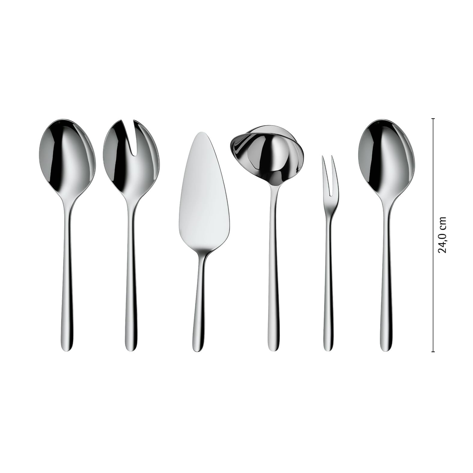 • 66-teiliges Besteck-Set für 12 Personen: 12 Menuegabeln, 12 Menuemesser, 12 Menuelöffel, 12 Kuchengabeln, 12 Kaffeelöffel, 1 Salatbesteck (2-teilig), 1 Servierlöffel, 1 Portionsschöpfer, 1 Serviergabel, 1 Tortenheber