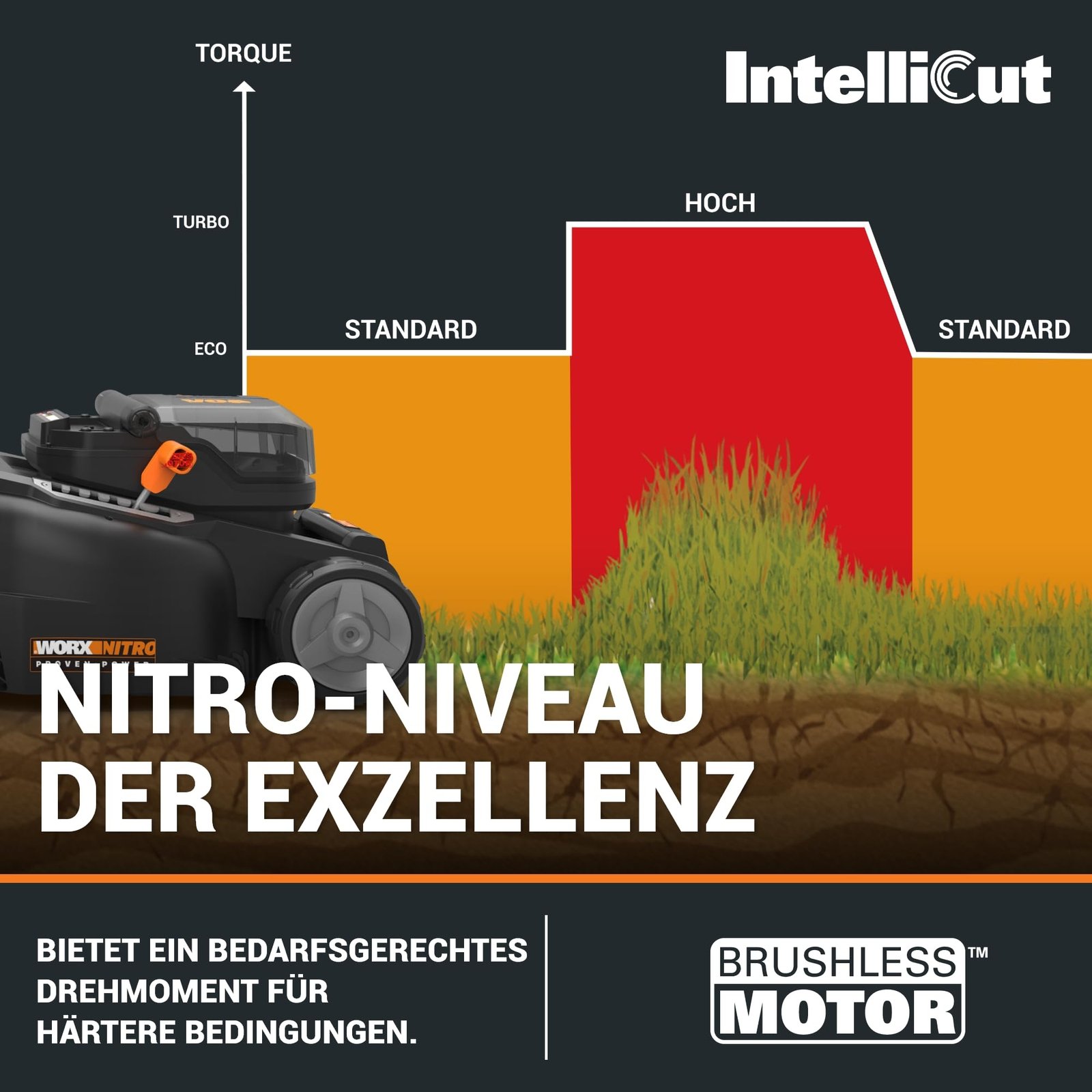 Dank der intelligenten IntelliCut-Technologie passt der Mäher seine Leistung automatisch an die Rasenbedingungen an. Bei dichterem oder höherem Gras wird die Motorleistung erhöht, während bei leichteren Bedingungen energiesparend gearbeitet wird. So wird eine gleichmäßige Schnittleistung erreicht und die Akkulaufzeit optimal genutzt.